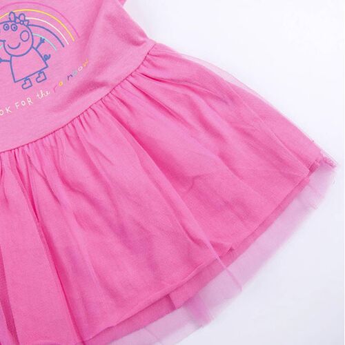 Το φόρεμα της Πέππα είναι ροζ, η φούστα είναι ροζ, ίδιο χρώμα με το πάνω μέρος του φορέματος και έχει τούλι. Το κολάν είναι ριγέ πολύχρωμο στα χρώματα του ουράνιου τόξου