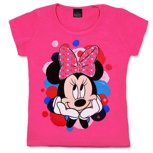 Ένα χαριτωμένο T-shirt, κοντομάνικο μπλουζάκι, με την αγαπημένη Minnie ! Η μπροστινή πλευρά του T-shirt είναι χρώματος ροζ, με ροζ λαιμόκοψη και μανικάκια, απεικονίζεται η Minnie . Η πίσω πλευρά της μπλούζας είναι χρώματος ροζ.