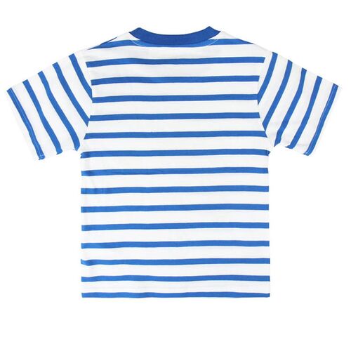 Το παιδικό μπλουζάκι είναι ριγέ λευκό με μπλε.