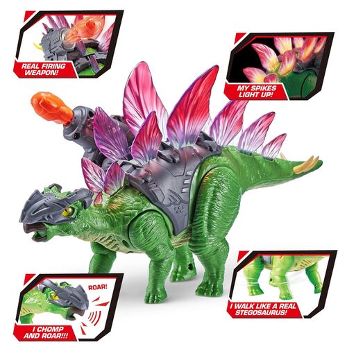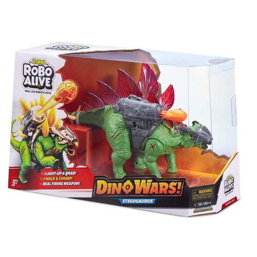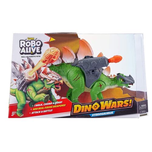 Ο νέος Robo Alive Στεγόσαυρος είναι έτοιμος για τη μάχη των δεινοσαύρων! Ο Στεγόσαυρος Dino Wars κινείται και περπατάει σαν αληθινός δεινόσαυρος, βρυχάται και έχει ρεαλιστικά μάτια. Με μεγάλα πτερύγια που φωτίζουν στην πλάτη του, πανοπλία και μεγάλο όπλο εκτόξευσης, ο Στευγόσαυρος είναι απαραίτητος για την επόμενη μάχη. Ας ξεκινήσουν τα Dino Wars!