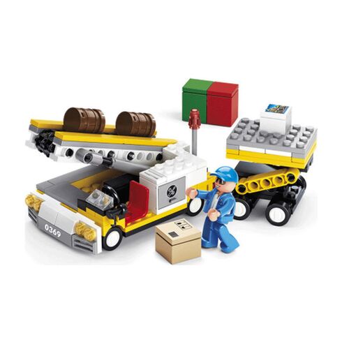 Ένα φορτηγάκι αεροσκάφους, για τα αγοράκια. Ένα παιχνίδι για να εμπλουτίσει τον φανταστικό κόσμο των παιδιών! Με το σετ παιχνιδιού, το παιδί μπορεί να δημιουργήσει ένα φορτηγάκι αεροσκάφους, το οποίο διαθέτει ερπύστριες για τη μεταφορά των αποσκευών, από το αεροσκάφος στο φορτηγάκι. Το φορτηγό ρυμουλκεί αποσπώμενο μη αυτοκινούμενο όχημα, για την μεταφορά των αποσκευών ! Το παιχνίδι επίσης περιέχει έναν οδηγό-υπάλληλο, κουτιά και βαρέλια αποκευών. Ο χρόνος της συναρμολόγησης χαρίζει στα παιδιά ευχάριστες στιγμές, καθώς προσαρμόζουν τα κομμάτια, ενώ η όλη διαδικασία συντελεί στην ανάπτυξη, της επιδεξιότητας των χεριών τους, και στην ικανότητα της παρατήρησης. Το προϊόν αυτό δεν προσφέρεται για παιδιά κάτω των 3 ετών, εξαιτίας των μικρών κομματιών που διαθέτει και μπορούν να γίνουν επικίνδυνα για τα παιδιά, λόγω κατάποσης.