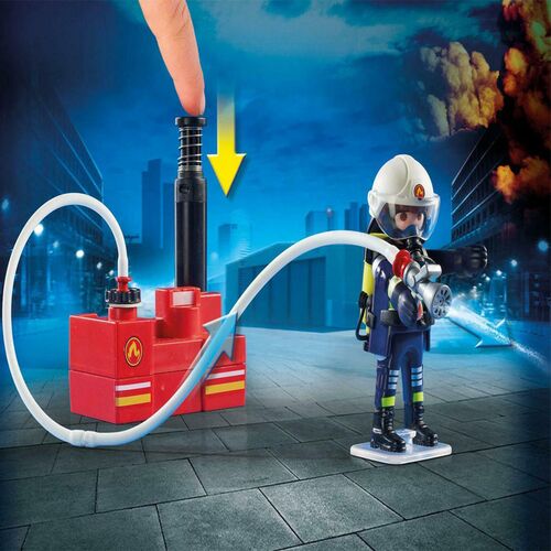 "Σβήστε τη φωτιά" με πραγματικό νερό. Η αντλία νερού μπορεί να συνδυαστεί με τους κωδ.: 9463 Όχημα Πυροσβεστικής με σκάλα και καλάθι διάσωσης, 9464 Πυροσβεστικό Όχημα και 9466 Όχημα Πυροσβεστικής με τροχαλία ρυμούλκησης.