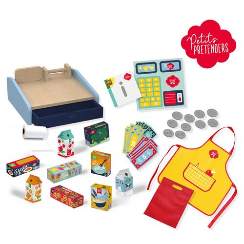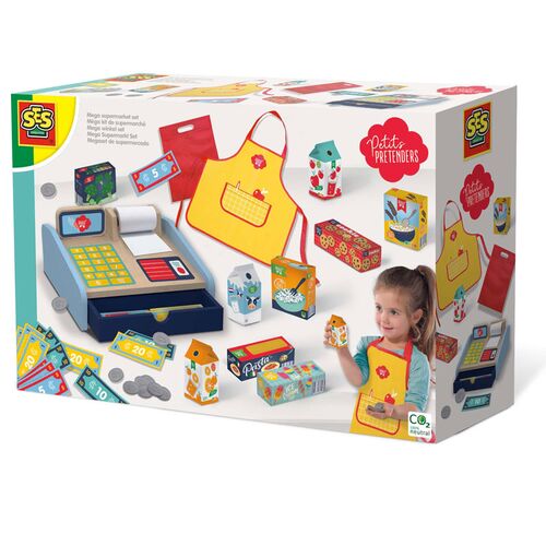 Αυτό το εκτεταμένο σετ ξύλινων ταμειακών μηχανών από τη σειρά Petits pretenders της SES περιέχει όλα όσα χρειάζεστε για να ξεκινήσετε το δικό σας σούπερ μάρκετ. Φορέστε την ποδιά σας, γιατί υπάρχουν πελάτες στην ουρά για να κάνουν τα ψώνια τους. Οι πελάτες μπορούν να γεμίσουν την τσάντα για ψώνια τους με είδη παντοπωλείου και στη συνέχεια να έρθουν να πληρώσουν στο ταμείο σας. Τι θα κοστίσει; Δώστε πίσω τα σωστά ρέστα και μην ξεχάσετε να ρωτήσετε αν οι πελάτες θα ήθελαν την απόδειξή τους. Ωραίο να παίζεις μαζί με φίλους.