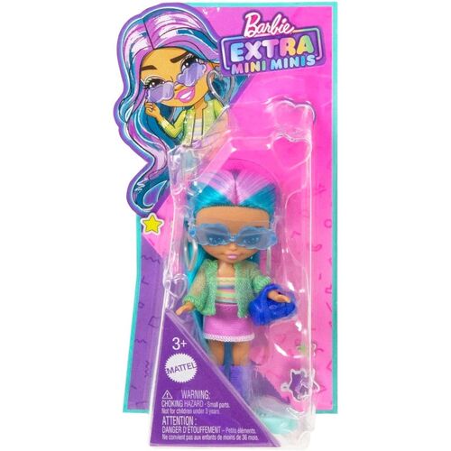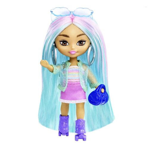 - Αυτή η κούκλα Barbie Extra Mini έχει σπορ στυλ. Έχει μακριά μπλε μαλλιά με ροζ κλειδαριές και φοράει τοπ ουράνιο τόξο και ροζ φούστα με διάφανο σακάκι.