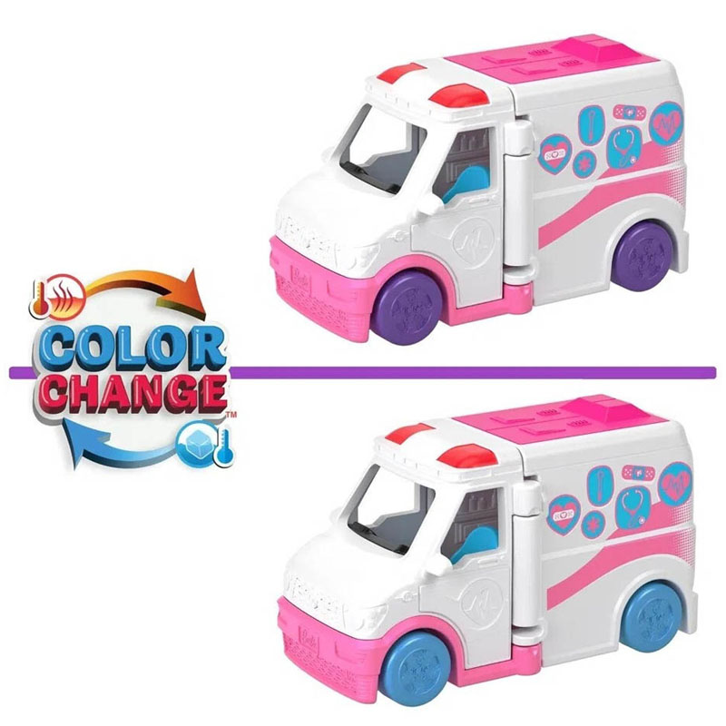 • Κάθε σετ περιλαμβάνει ένα αντίγραφο μικρής κλίμακας των θρυλικών οχημάτων της Barbie, με εντυπωσιακή λειτουργία αλλαγής χρώματος και κουκλίτσα 3,8 εκ.!