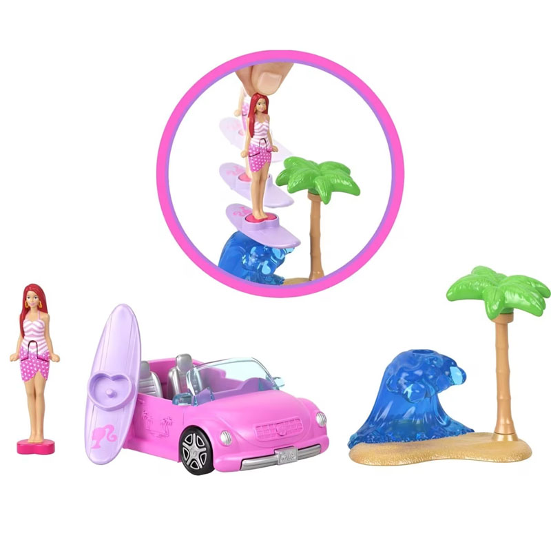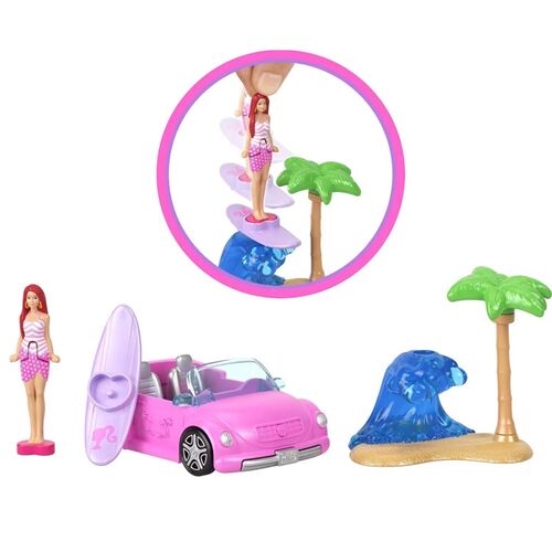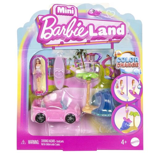 Καλώς ήρθατε στη Mini BarbieLand όπου οι αγαπημένες κούκλες Barbie, τα οχήματα και τα σετ παιχνιδιού έχουν μικροσκοπικό μέγεθος! Τα παιδιά μπορούν να διαλέξουν μεταξύ του Dreamplane, Dreamcamper, Dreamboat, Convertible, ή Jeep! Κάθε συσκευασία περιέχει ένα όχημα και μία mini κούκλα Barbie. Το σώμα της κούκλας μπορεί να λυγίσει και να τοποθετηθεί μέσα στο όχημα. Color change εκπλήξεις!