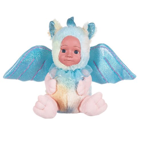 Η κούκλα-μωρό είναι λούτρινη με πλαστικό πρόσωπο, φοράει γαλάζιο με κίτρινο και πράσινο γούνινο κοστούμι-φορμάκι μονόκερου, ένα γαλάζιο τούλι γύρω από τον λαιμό και έχει γαλάζια με γκλίτερ : φτερά, κέρατο και αυτάκια . Ένα χαριτωμένο μωρό μεταμορφωμένο σε μονόκερο, συντροφεύει τα κορίτσια στο φανταστικό κόσμο των παιχνιδιών!