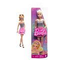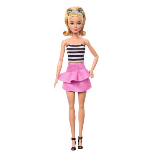 Εμπνευσμένη από το εμβληματικό πρώτο της μαγιό του 1959, η κούκλα Barbie Fashionistas φοράει ασπρόμαυρο ριγέ τοπ και ροζ βολάν φούστα. Οι μαύρες γόβες και τα μπλε γυαλιά ηλίου αναδεικνύουν το κλασικό και μοντέρνο στυλ ταυτόχρονα! Τα ξανθά μαλλιά της είναι χτενισμένα σε ψηλή αλογοουρά τέλεια για κάθε περίσταση!