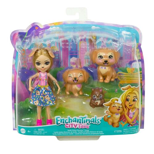 Αυτό το οικογενειακό σετ Enchantimals City Tails περιλαμβάνει την κούκλα Gerika Golden Retriever (6"), 2 κουτάβια και 1 φιγούρα σκίουρου. Η κούκλα Gerika Golden Retriever λατρεύει να νιώθει τον άνεμο στα κυματιστά μαλλιά της με ροζ κλειδαριές. Πάντα συνοδεύεται από τις καλύτερες φίλες της. Οι αξιολάτρευτες φιγούρες των ζώων, η καθεμία με την τρυφερότητα που τη χαρακτηρίζει, θα λατρέψουν να παίζουν με αυτή την ιδιαίτερη οικογένεια των Enchantimals.