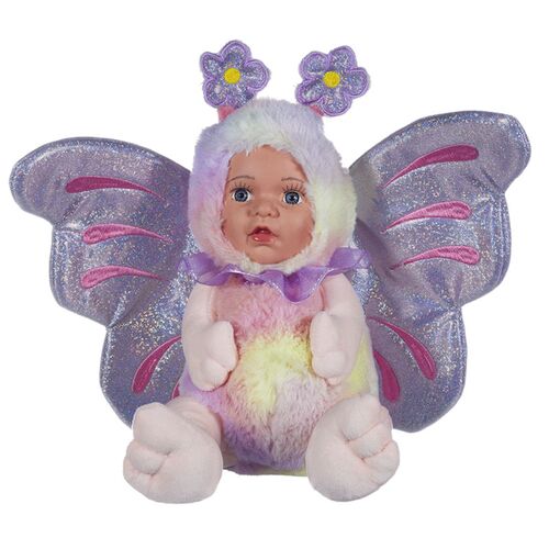 Μία υπέροχη πεταλούδα σε λούτρινο παιχνίδι! Η πεταλούδα είναι μοβ χρώματος με γκλίτερ στα φτερά και στις κεραίες, το σώμα της είναι στις αποχρώσεις του μοβ-ροζ-κίτρινου, το πρόσωπο της είναι πλαστικό και τα άκρα της είναι μπεζ χρώματος. Η πεταλούδα φοράει ένα μοβ τούλι γύρω από τον λαιμό της.