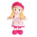 Η πάνινη κούκλα φοράει ένα καρό φουστάνι κι από μέσα μια φούξια μπλούζα, έχει ξανθά μαλλιά και φοράει ένα ροζ καπέλο που στο τελείωμα του είναι καρό